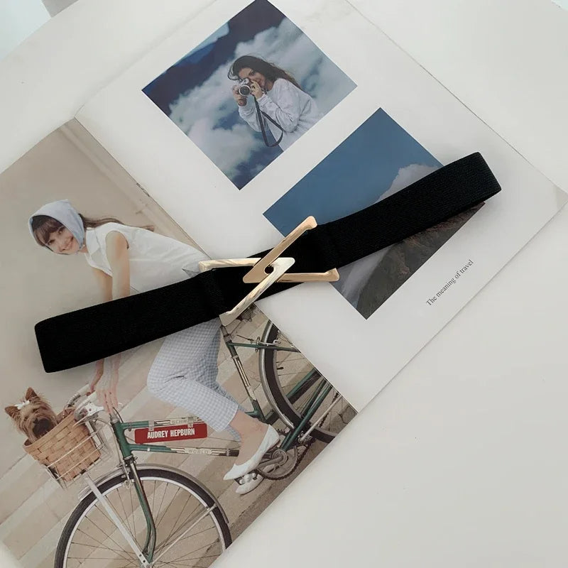 Featuring a sharp, polished triangle buckle and a wide elastic band for a smooth, contoured fit, this belt sculpts the waist with clean precision and zero bulk. A bold finishing piece—perfect over tailored coats, flowing dresses, or oversized layers.
